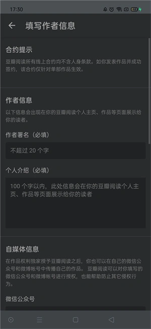 4、填写申请内容时,需署上个人笔名、介绍及联系方式,并选择适合自己的类型创建小说。刚入门的朋友若在创作过程中遇到问题,可通过下文中的“常见问题”寻求解决办法。