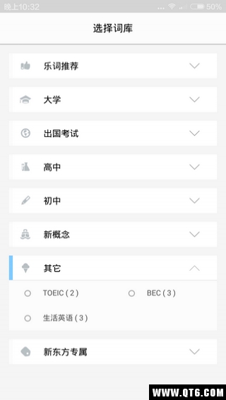 1)注册成功之后,第一步就要选择词库。作为一个已工作四年且无出国意向的人,很杯具地发现满屏选项中没一个真正适合自己。它目前大概仅考虑到了新东方学员所属的那批用户。我只能勉为其难地选择了“其他“,再点“生活英语”……