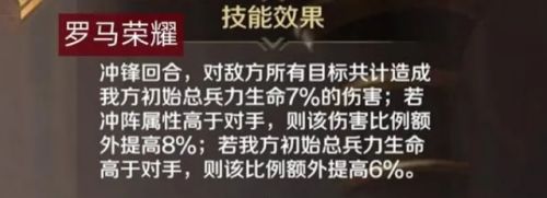 罗马荣耀以主打输出为主,各种BUFF吃满,总伤害比例高达21%。理解起来比较简单,适合无脑输出的队伍,如萨拉丁突击队;