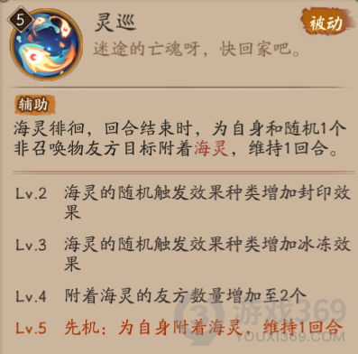 海灵徘徊,回合结束时,为自身和随机1个非召唤物友方目标附着海灵,维持1回合。