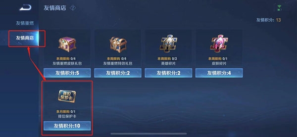 3、来到友情商店,消耗10点友情积分购买一张排位保护卡去,且一个月只能买一次。