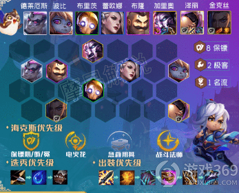 4-5升级8人口,如果这时候质量够血量高,可直接攒钱准备升级9人口,如果质量差就需要大搜卡找到卡莎、金克丝、泽丽、杰斯任意两枚棋子搭配6保镖就可锁血,稳血后在攒钱升级9人口,添加加里奥开8保镖羁绊,5费全2星阵容大成。