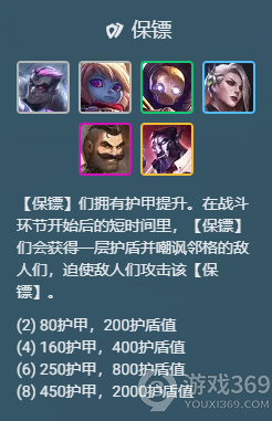 这是一套坦度极高的阵容,8保镖羁绊下保镖棋子能增加450护甲与2000护盾,非常克制当前版本大热门的物理输出阵容,只要成型基本稳定前二。