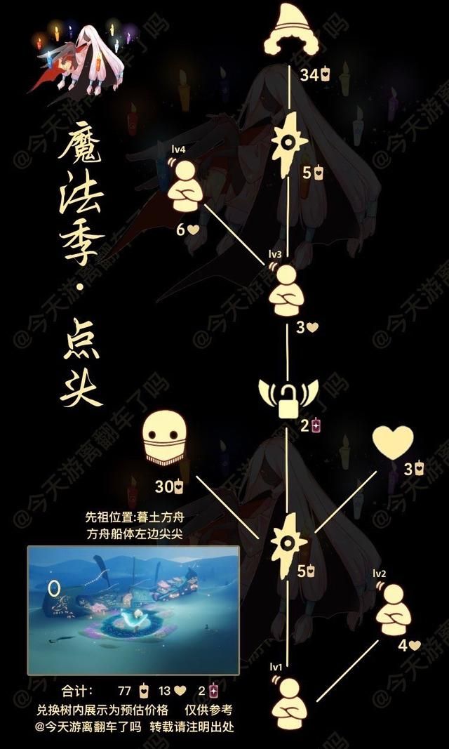 1、点头先祖在方舟大船底下,位于左边卖魔法的地方;