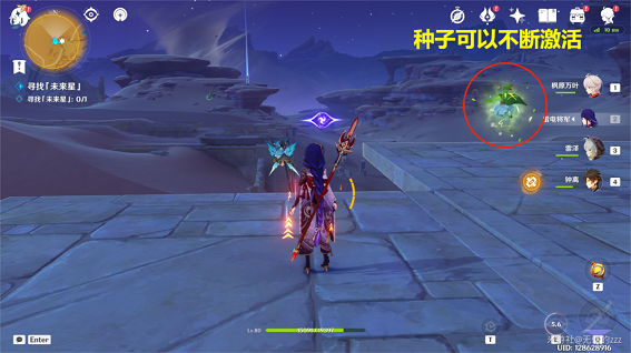 过关技巧:我们需要利用雷元素来攻击三乘种子,使其变为激活状态,从而让隐形的楼梯显形出来,根据三乘种子的移动,不断刷新台阶位置