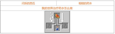 8、治疗药水,顾名思义使用和可以回复玩家生命值的药水。用粗制药水和闪烁的西瓜炼制,可以回复三格血,再和萤石炼制回复六格血的2级治疗药水。如果和发酵蛛眼炼制就会变成伤害药水,效果是扣三格血,加萤石炼制扣六格血的2级伤害药水。