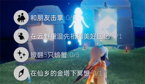 光遇2022年11月4日每日任务怎么做?游戏中每天都会更新四个全新的任务可以完成,每一个都是不一样的,通过完成任务来获得相对应的奖励和道具,今天的任务是和朋友击掌、在云野重温先祖的美好回忆、掀翻5只螃蟹、在仙乡的金塔下冥想,完成方法玩家可以参考一下,下面小编给各位小伙伴们分享一下光遇11.4每日任务攻略。