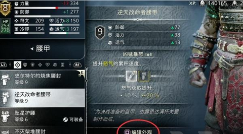 在盔甲页面,选中满级的盔甲,就会在盔甲介绍的底部看到“编辑外观”的选项(如下图)。
