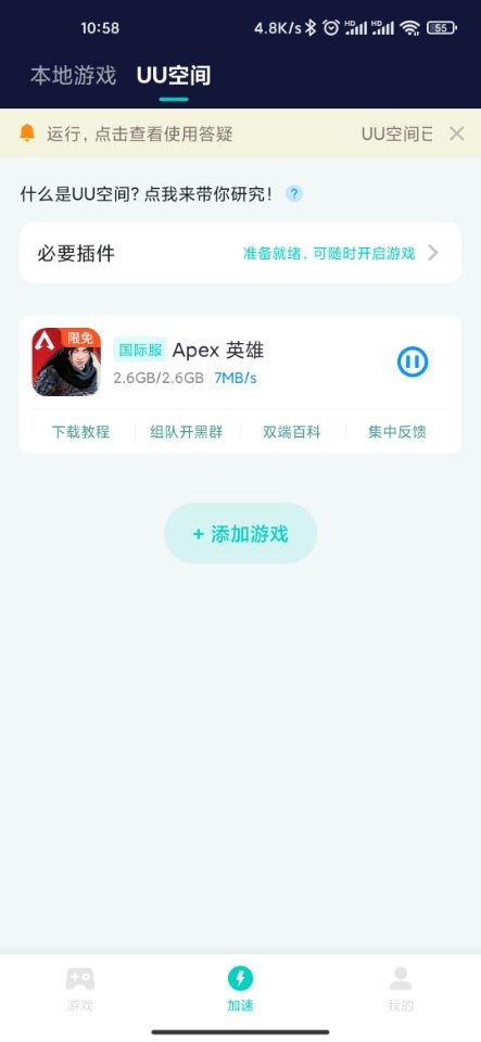 一开始在UU里面还没找到这款游戏,说是不提供下载,然后我就去UU官网重新下了一个新版本,这个版本里面有个UU空间,在这里找到Apex手游,并把其中的必要插件和游戏文件下载在UU空间中后,就可以进入游戏了,加速区服有东南亚和澳洲,一开始选择东南亚进不去,换成澳洲就可以了。