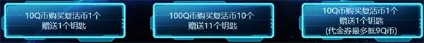 1、玩家通过10Q币就可以购买复活币1个并且获得1个钥匙。