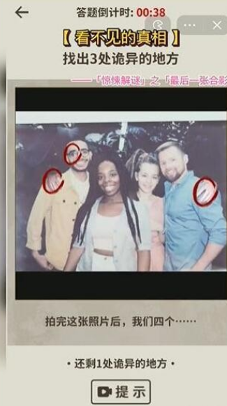 1、本关卡提示是:找出三处诡异的地方,拍完这张照片后,我们四个...