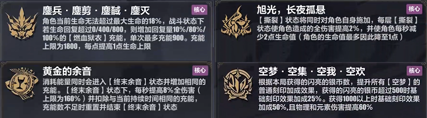 空梦一:杀怪掉银币、全伤、物理元素。一般来说解锁核心就行,但有条件的话建议拿到增幅刻印的必杀倍率。