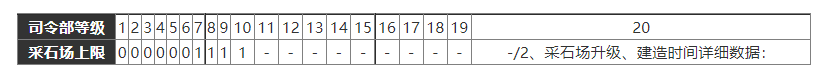 1、不同司令部等级下,采石场可以建造的数量上限: