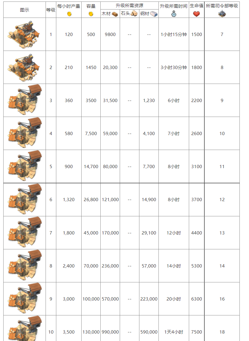 2、采石场升级所需资源、时间等详细数据: