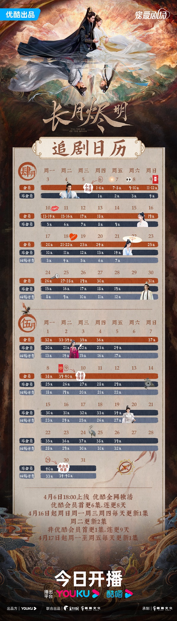 4月16日起周日周一周三周四每天更新1集,周二更新2集;非优酷会员首更1集,连更9天,4月17日起周一至周五每天更新1集~