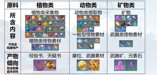 植物→经验书、天赋书;动物→摩拉、武器素材;矿物→精炼矿、元素石