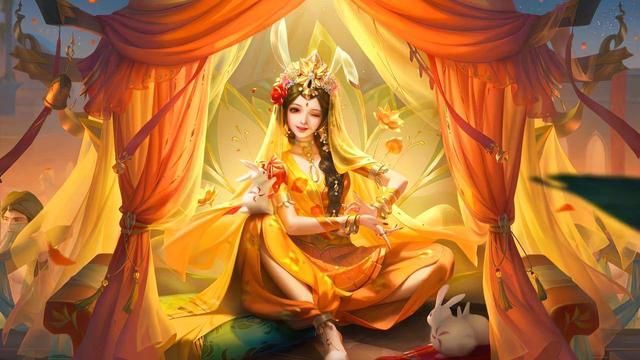 在西游记的剧情中,天竺公主的主要展示时间,其实并不是天竺公主本身,而是由玉兔精所幻化的天竺公主,而在这款皮肤海报中,玉兔的元素也多次出现,不仅直接有三只兔子在身旁。头上也有着类似于兔耳朵的元素,所以极有可能这款皮肤也是玉兔精所化的天竺公主。